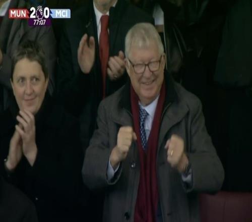英超第22轮曼市德比,曼联主场对阵曼城,在曼联取得2-0领先后,红魔功勋主帅弗格森爵士在看台上握拳庆祝。此役主场对阵曼城,弗格森爵士昔日弟子卡里克迎来第二次执教曼联首秀,曼联